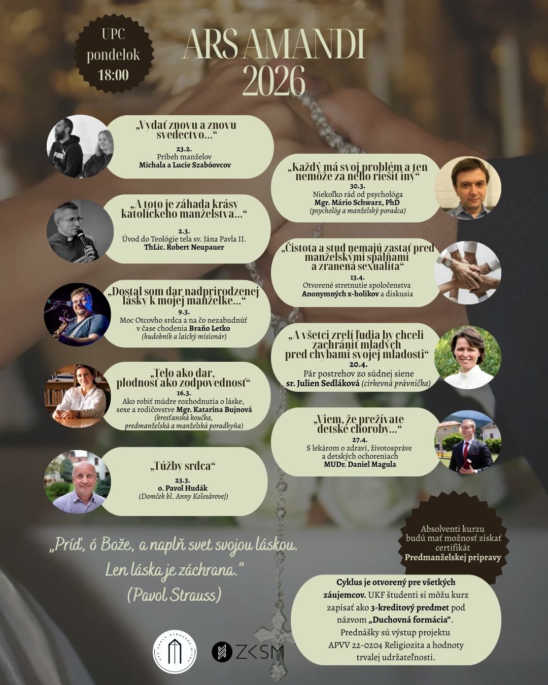 Univerzitné pastoračné centrum Pavla Straussa Nitra vás pozýva na cyklus prednášok ARS AMANDI 2026. Uskutočnia sa od 23. februára do 27. apríla 2026, každý pondelok o 18.00 h v UPC, Dolnozoborská 25/32, Nitra.