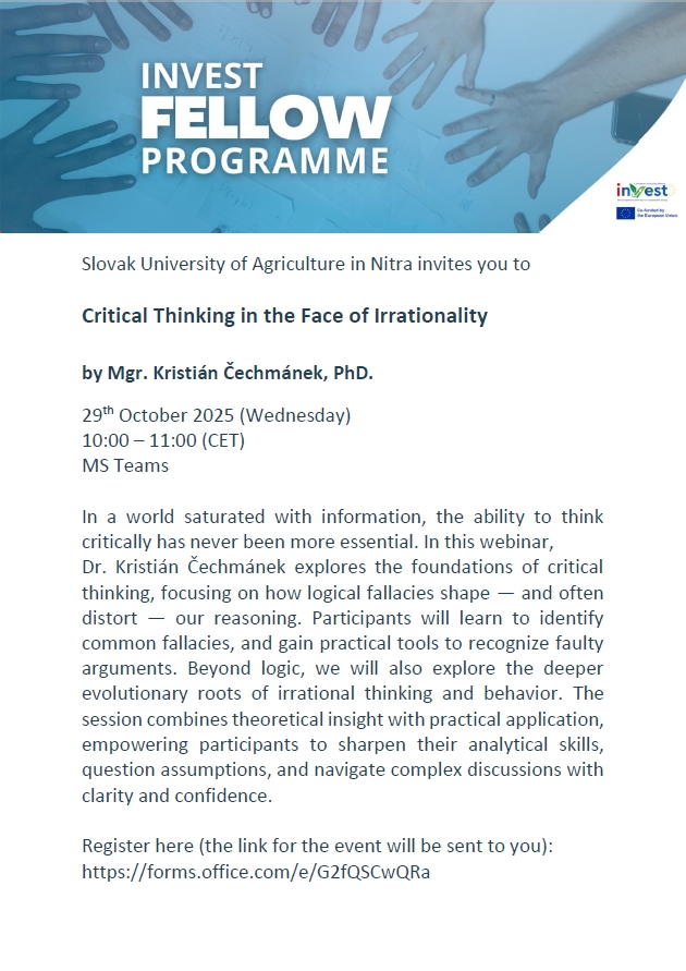 In a world saturated with information, the ability to think critically has never been more essential. In this webinar, Dr. Kristián Čechmánek explores the foundations of critical thinking, focusing on how formal and informal logical fallacies shape — and often distort — our reasoning. Participants will learn to identify common fallacies such as confirmation bias, post hoc ergo propter hoc, false dilemmas, ad hominem attacks, and slippery slopes, gaining practical tools to recognize faulty arguments in everyday life, media, and professional contexts.