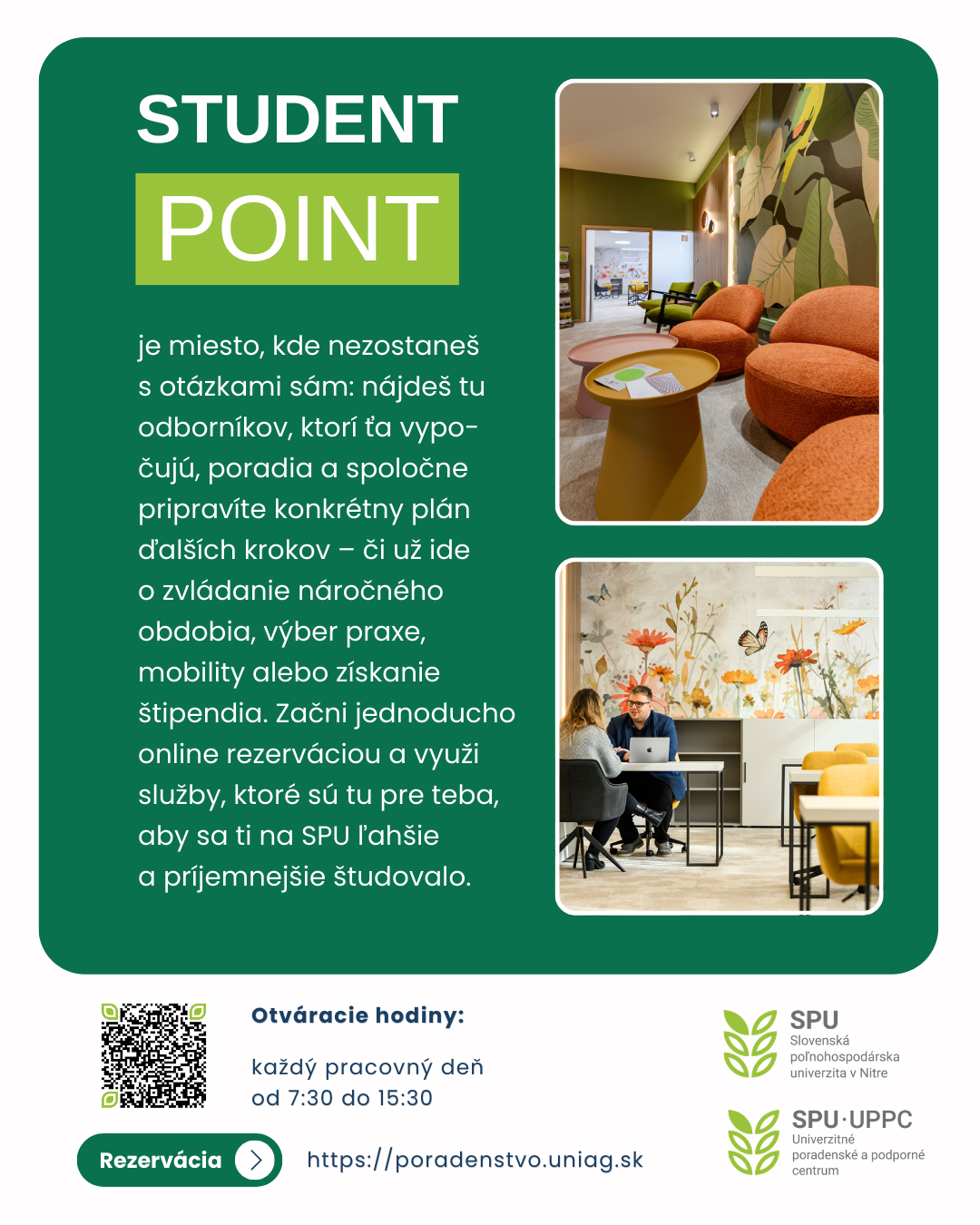 Student Point funguje na SPU od 24. februára 2026 a združuje poradenské a podporné služby Univerzitného poradenského a podporného centra (UPPC) tak, aby študenti našli odpovede na jednom mieste a dostali sa priamo k správnym odborníkom. Na stretnutie sa môžu objednať rýchlo cez online rezervačný formulár na webe https://poradenstvo.uniag.sk/, kde si sami vyberú druh poradenstva, termín aj pracovníka, ktorý sa im bude venovať. Systém je prehľadný a ušetrí študentom čas. Cieľom je, aby študenti dostali odpovede na svoje otázky a odchádzali s pocitom, že na to nie sú sami.