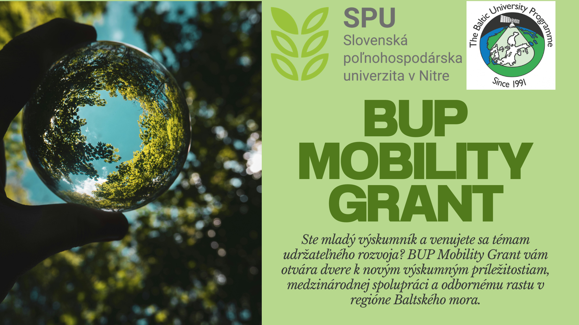 Mobilitný grant BUP je určený na rozvoj a posilnenie spolupráce medzi mladými výskumníkmi v regióne Baltského mora na univerzitách zapojených do programu BUP. Grant pokrýva cestovné náklady a ubytovanie spojené s realizáciou výskumného projektu, pričom maximálna výška podpory je 3 000 EUR. Určený je mladým vedcom, ktorí sa venujú výskumu v oblasti udržateľného rozvoja. Oprávnenými žiadateľmi sú uchádzači, ktorí ukončili doktorandské štúdium (PhD.) v priebehu posledných 5 rokov. O finančnú podporu je možné žiadať na nové výskumné projekty (úplné alebo čiastočné financovanie), ako aj na podporu už prebiehajúcich projektov. Cieľom je podpora internacionalizácie, preto je podmienkou, aby účastník absolvoval výskumný pobyt na univerzite v krajine regiónu Baltského mora.
